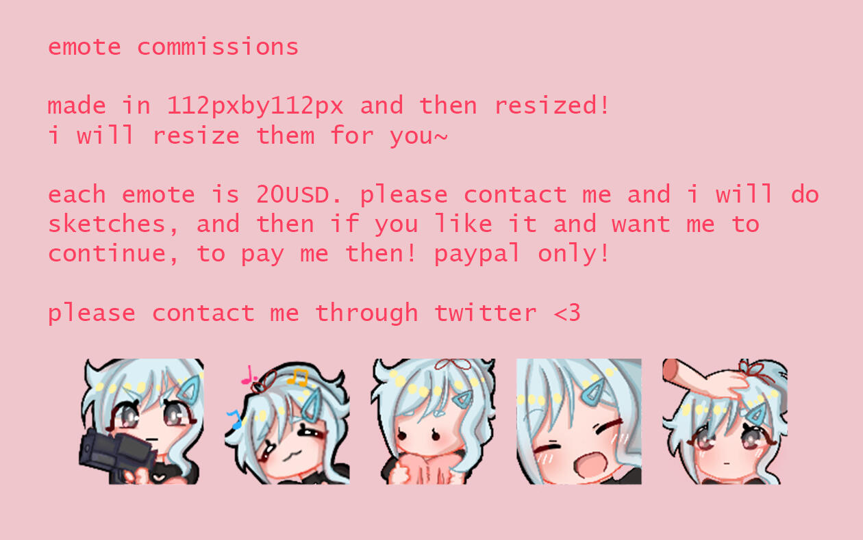hi! my emote commissions are pretty simple! 20 dollars per emote, and each are in this style! if its super conplicated, then +5, per complicated emotes, but other than that, my prices are solid!contact me through twitter!